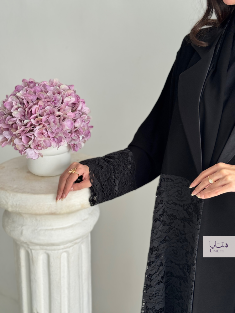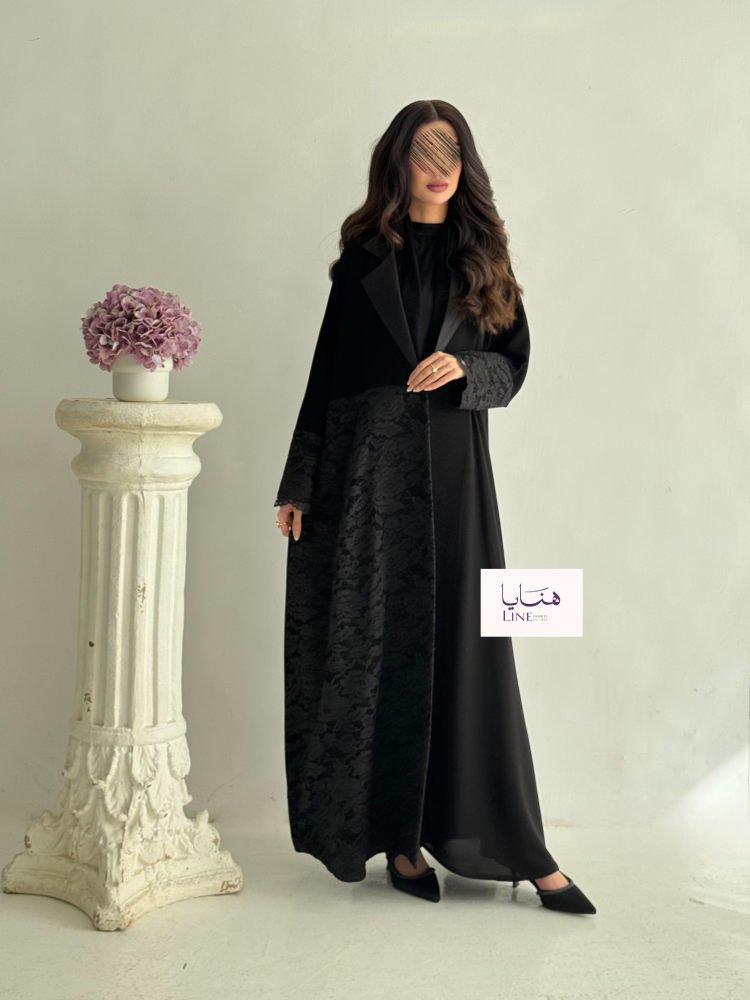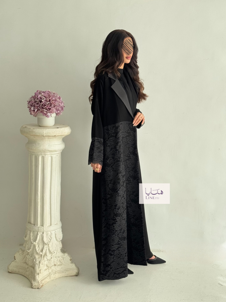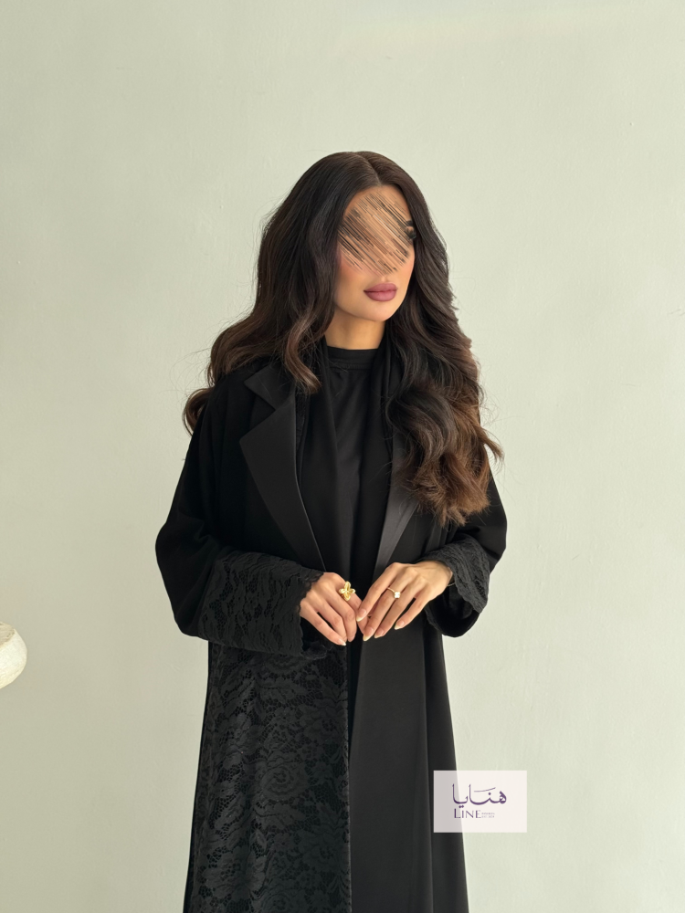 تتزين العباية بلمسات دانتيل راقٍ على الامام والأكمام، تضفي لمسة من الرقة والتفرد، وكأنها بلسم يكسو إطلالتك بسحر لا يُقاوم.